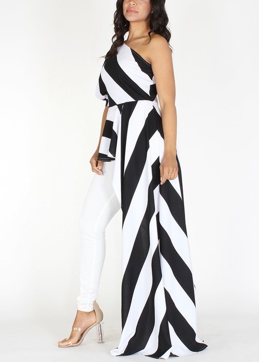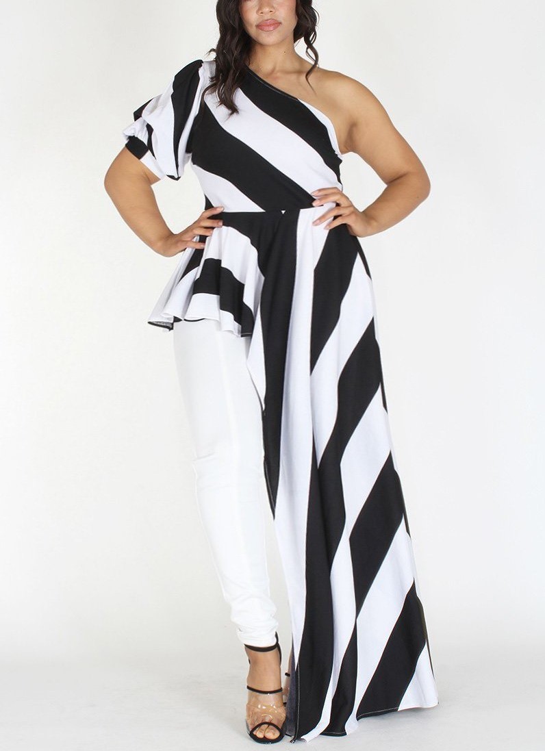 For a flirty take on ladylike we love this Black and White Stripe One Shoulder fitted flare asymmetric peplum hem top. This mid-weight style is cut for a slim fit and features a flattering a one shoulder neckline ,A peplum waist with pointed hem detail finishes the look in a flattering way. Lightweight stretch knit. square neckline. one short puff sleeve.